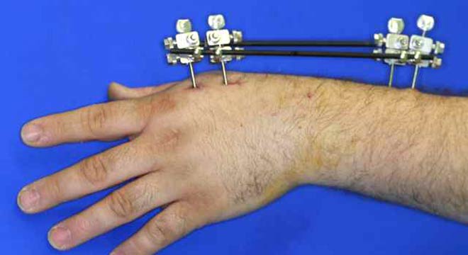 در این حالت، از تثبیت خارجی که شامل اتصال میله یا صفحه به قسمت بیرونی دست و وصل کردن آنها به داخل استخوان از طریق پوست است، استفاده می شود.