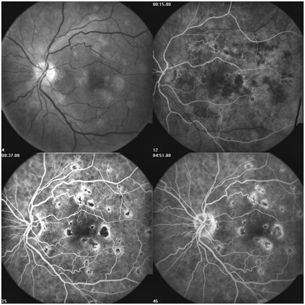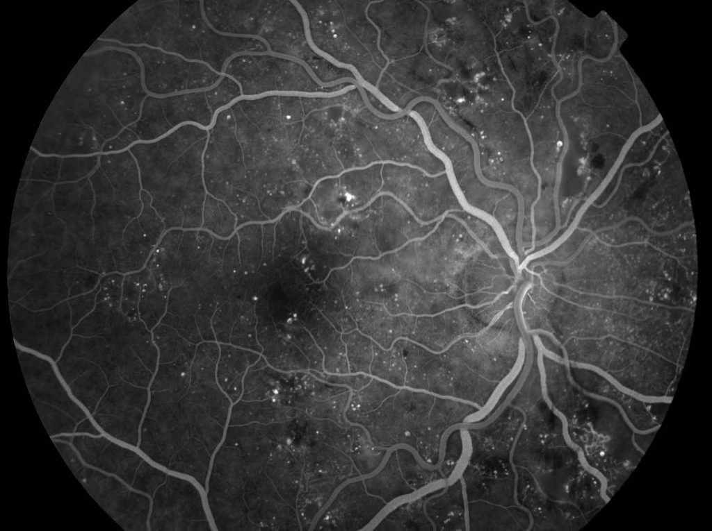 بازشدن مردمک حدود ۲۰ دقیقه بطول می انجامد. پس از طی این مراحل، بیمار در جلوی دوربینی نشسته و پرستار از ته چشم شروع به عکس گرفتن می کند.برای اینکه رگهای شبکیه بهتر دیده شوند، یک مایع قرمز رنگ در دست بیمار تزریق می گردد ، انجام این تست غالبا هیچ گونه درد یا عوارضی نخواهد داشت.لازم به یادآوری است، به دلیل تزریق این ماده ؛ رنگ ادرار و پوست زردرنگ شده که پس از چند ساعت و با مصرف بیشتر مایعات رفع می گردد.پس از ظاهر شدن عکسها و بررسی آن توسط پزشک معالج ، نتیجه برای معاینات دیگر یا درمان های احتمالی لیزری ، به بیمار اعلام خواهد شد.