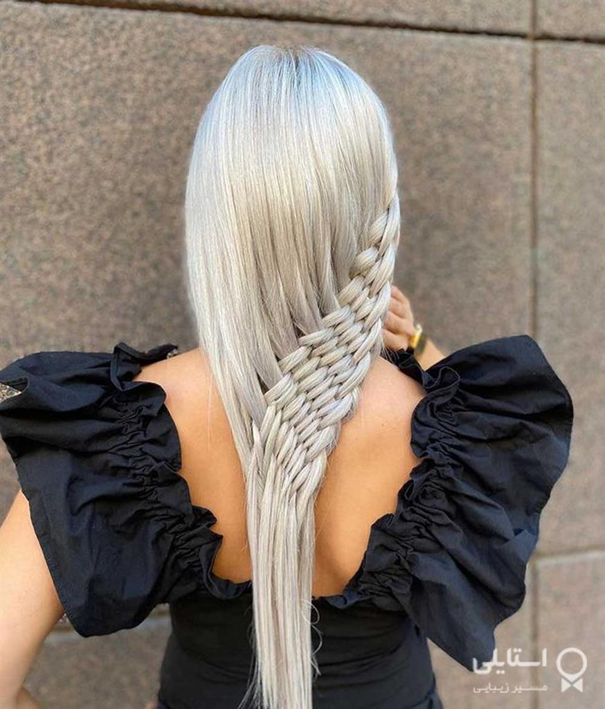این قفلهای پرزرق و برق از پشت دارای یک تار قلابدوزی نامتقارن است. موهای خاکستر بور در یک طرف ظاهری بافتنی دارد.