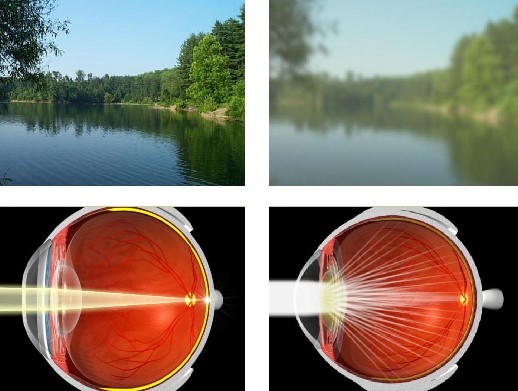 کیفیت تصویر در چشم طبیعی (سمت چپ) و چشم مبتلا به آب مروارید (سمت راست)