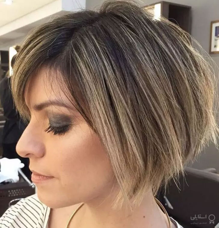 اگر زنی با موهای تیره بخواهد موهایش را بلوند کند، بهترین روش استفاده از هایلایتهای روشن است که همزمان به زمینهی تیرهی مو هم اجازه خودنمایی میدهد. برای فرم دادن به این مدل زیبای باب، از یک صافکنندهی مو استفاده کنید تا نوک موها به حالت تیز و رو به بیرون یا رو به پایین حالت بگیرد.